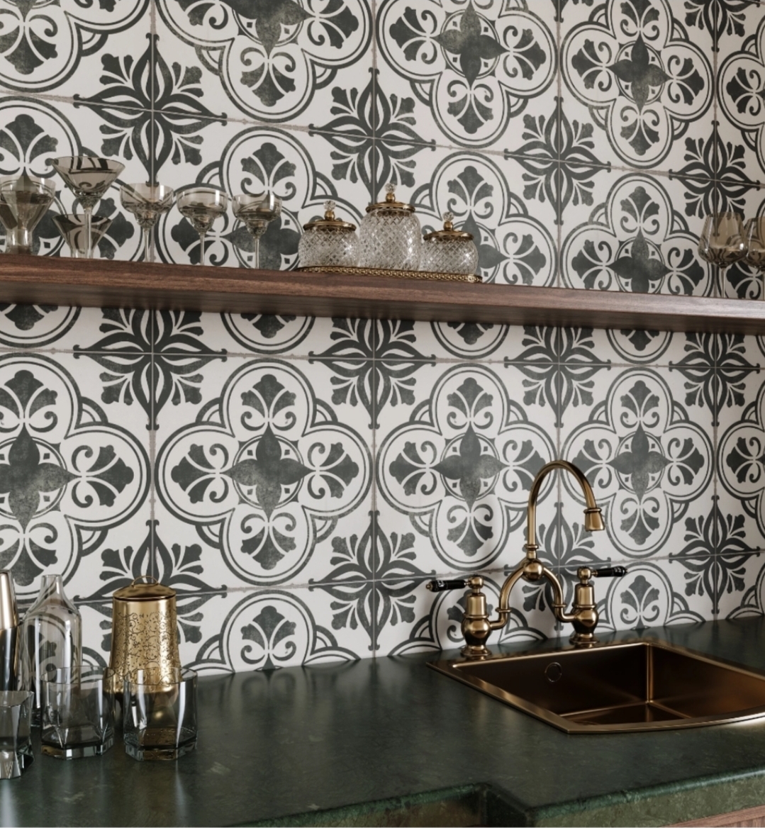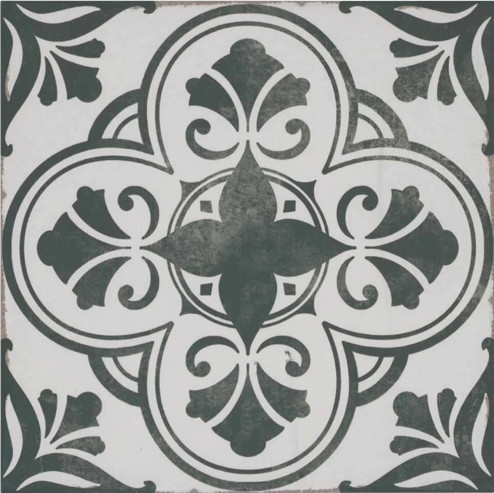 Expressing her signature "city chic" style, the Alison Victoria French Connection tiles are inspired by the HGTV star's travels to Paris and love of all things French. The detailed pattern is influenced by wood and iron scrollwork, typical of French architecture and design. The Saint Germain 13" x 13" porcelain wall and floor tile features a winter white background and dark green pattern with aged details that give it an antique appearance.