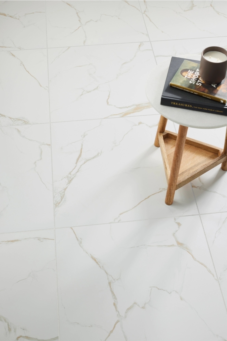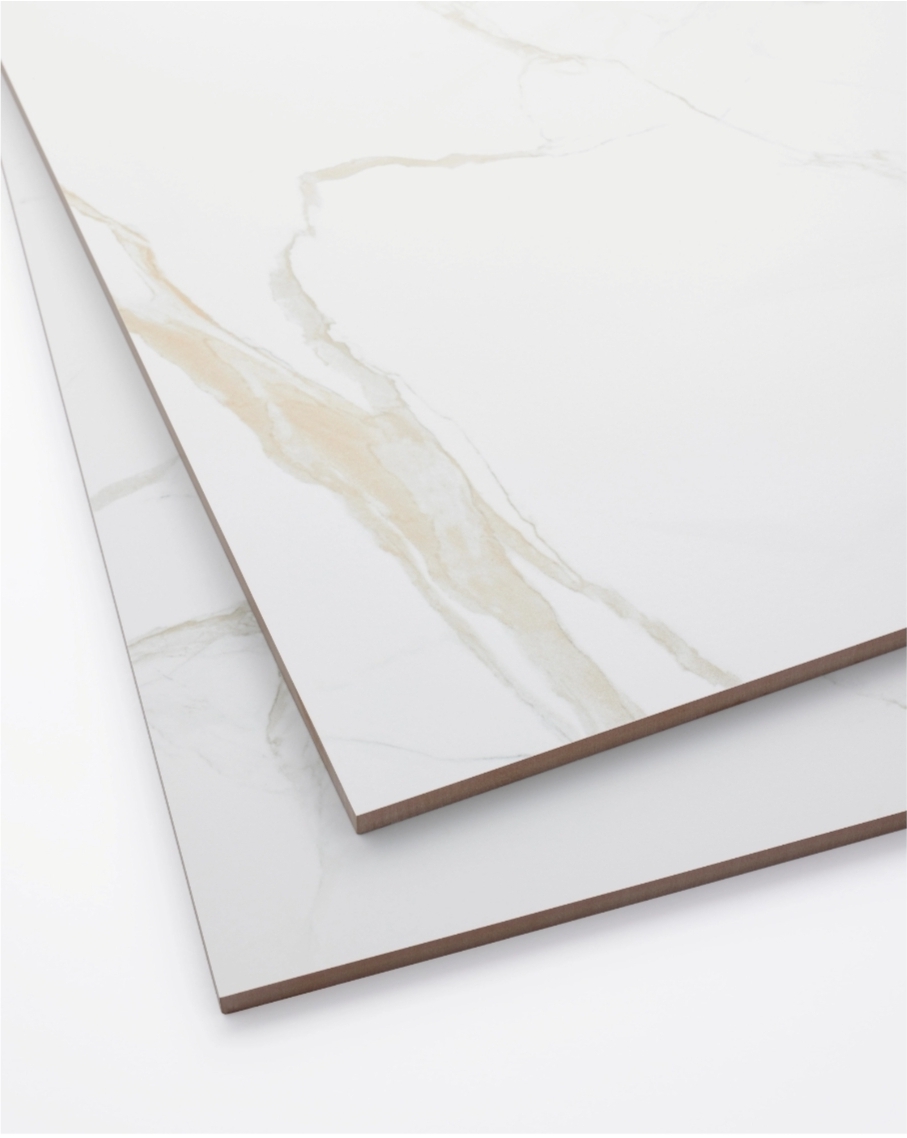 The elegance of marble and the durability of porcelain combine with the Marmo Calcatta Gold Matte porcelain wall and floor tile. This 24" x 24" large-format tile features a white background with beautiful gold veining for a look that's both classic and chic. This versatile tile will complement a range of design styles and elevate virtually any room.